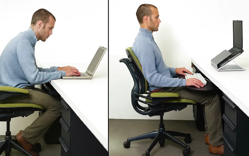 ارتفاع صندلی، مانیتور، پشتی، زیرپایی و زاویه لگن باید طوری تنظیم شود که کمترین فشار را به کمر وارد کند.